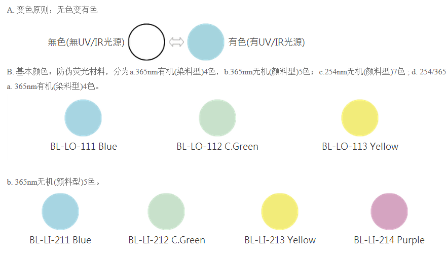 本系列產品特殊熒光體在可見光光源下,呈現白色或接近透明色,在不同波長光源下(254nm、 365 nm、 850 nm) 顯現一種或多種熒光色澤,包括有機、 無機、余暉等特殊效果,色彩鮮艷亮麗,熒光標識材料主要用于生產防偽油墨和標志塑料。
